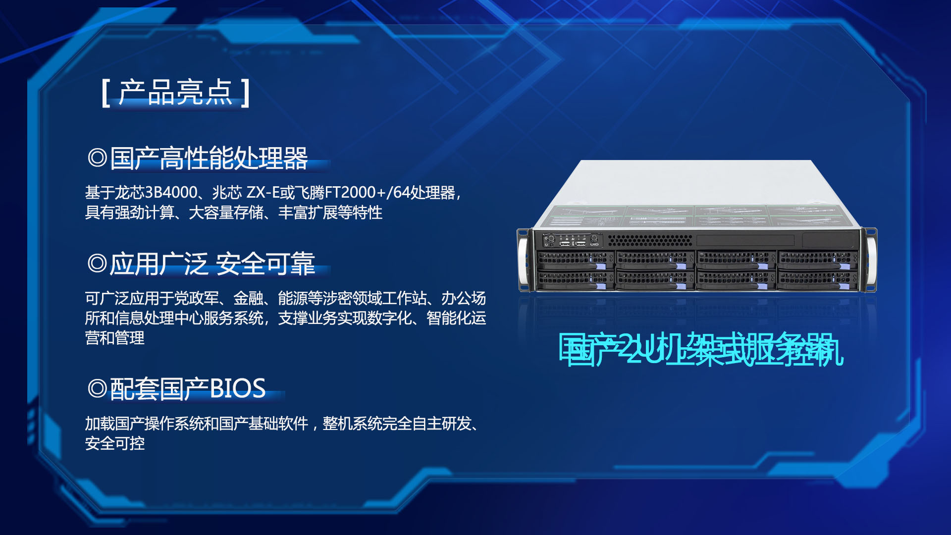 研恒(特控)國(guó)產(chǎn)2U機(jī)架式服務(wù)器基于龍芯3B4000、兆芯 ZX-E或飛騰FT2000+/64處理器,具有強(qiáng)勁計(jì)算、大容量存儲(chǔ)、豐富擴(kuò)展等特性,配套國(guó)產(chǎn)BIOS, 加載國(guó)產(chǎn)操作系統(tǒng)和國(guó)產(chǎn)基礎(chǔ)軟件,整機(jī)系統(tǒng)完全自主研發(fā)、安全可控。可廣泛應(yīng)用于黨政軍、金融、能源等涉密領(lǐng)域工作站、辦公場(chǎng)所和信息處理中心服務(wù)系統(tǒng),支撐業(yè)務(wù)實(shí)現(xiàn)數(shù)字化、智能化運(yùn)營(yíng)和管理。